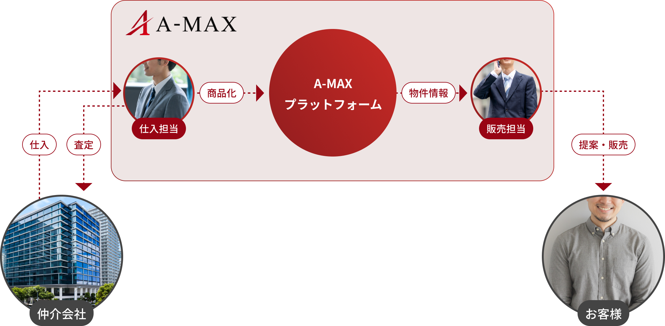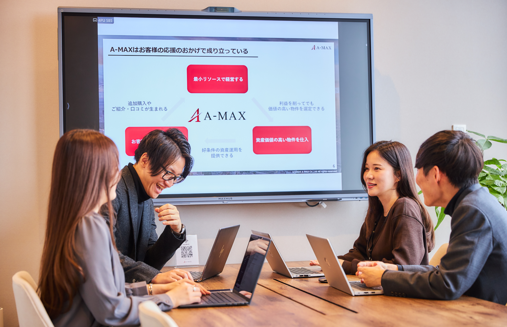"A-MAX"の社名の由来は"Asset MAX"=「お客様の資産の最大化」です。目の前のお客様を幸せにすることを本気で考え、圧倒的な生産性でお客様に価値の高い提案をすることで、お客様の資産最大化にコミットしています。私たちは売上や会社の規模拡大を目的とはしておらず、お客様にベストなご提案をし続けることが目的です。結果として、業界でも最速レベルの成長をすることができています。